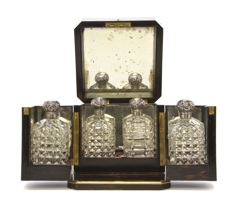 having a hinged top and sides opening to four cut glass bottles with silver caps, London 1892, bearing a maker's mark of MC.