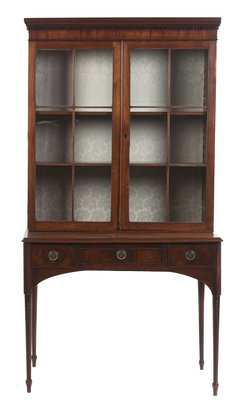 the upper section with a dentiled and ogee molded cornice above two glazed doors, the lower section with a central long drawer flanked by two short drawers, raised on cylindrical tapering legs.
