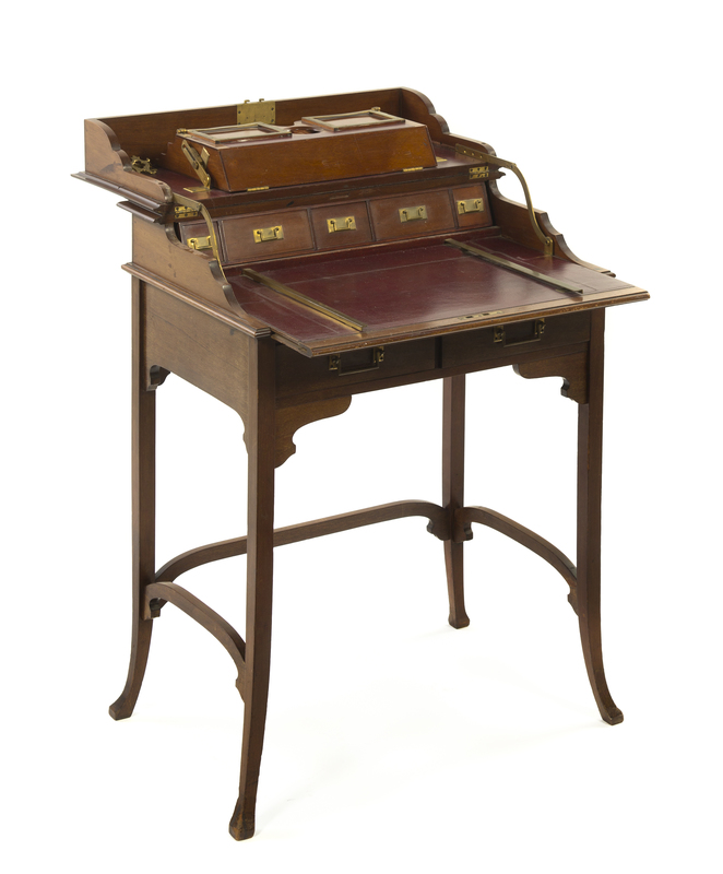 the lid lifting and extending the writing surface, revealing a fitted interior with five drawers above two short drawers, raised on slightly outswept legs, joined by stretchers, the locks marked Bramah London.