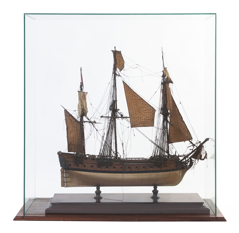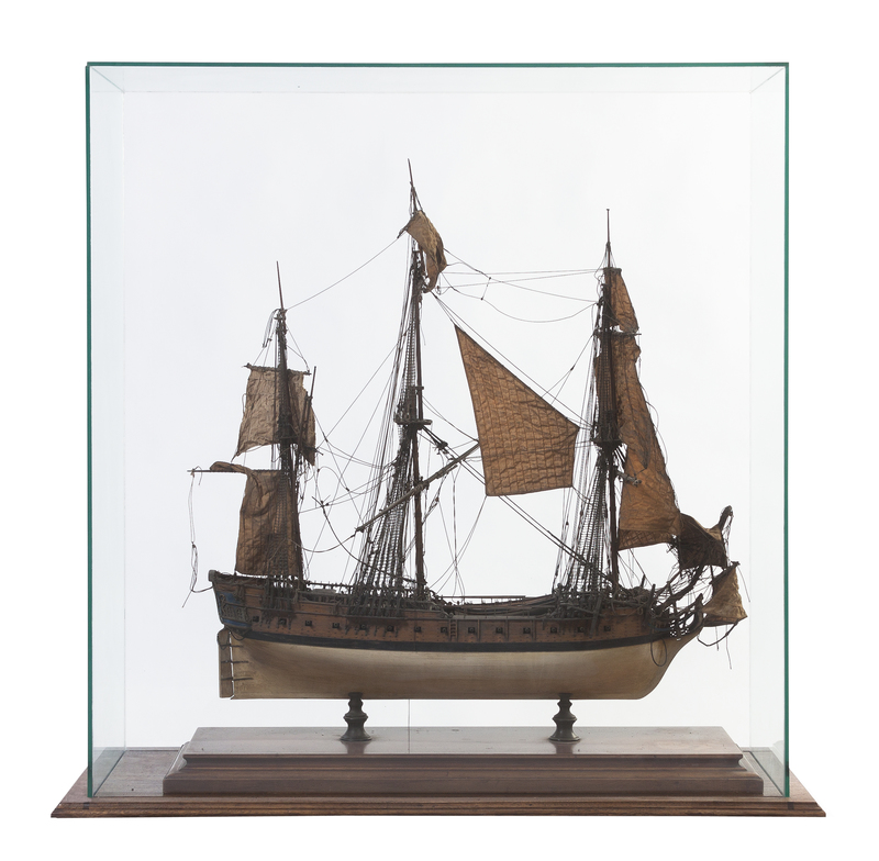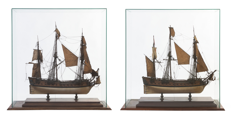 circa 1770, each modeled as a French naval frigate commonly used at the time, raised on a wood plinth base, set in a custom case.