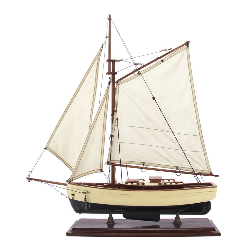 depicting a single masted sailing vessel having canvas sails, raised on a rectangular mahogany base.
