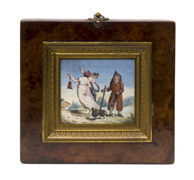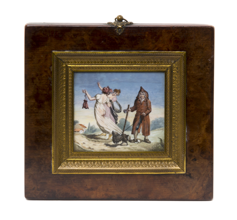 of rectangular form depicting two maidens and a mischievous pauper stepping on one of the maiden's dresses allowing a tear exposing her backside, the purse marked with an intertwined S and L, the lower right signed Dutailty, set in an Empire style gilt metal and burl walnut frame.