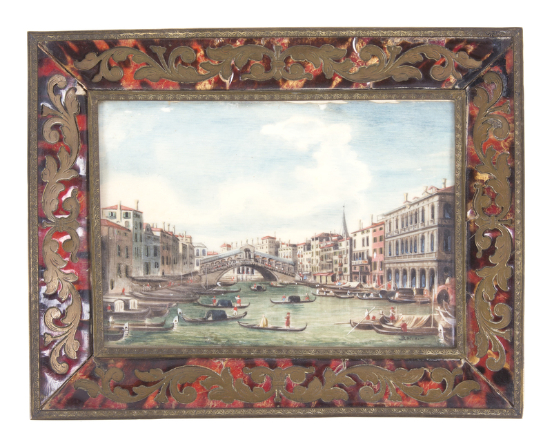 of rectangular form depicting the canals of Venice set in a boulle marquetry frame, signed indistinctly.