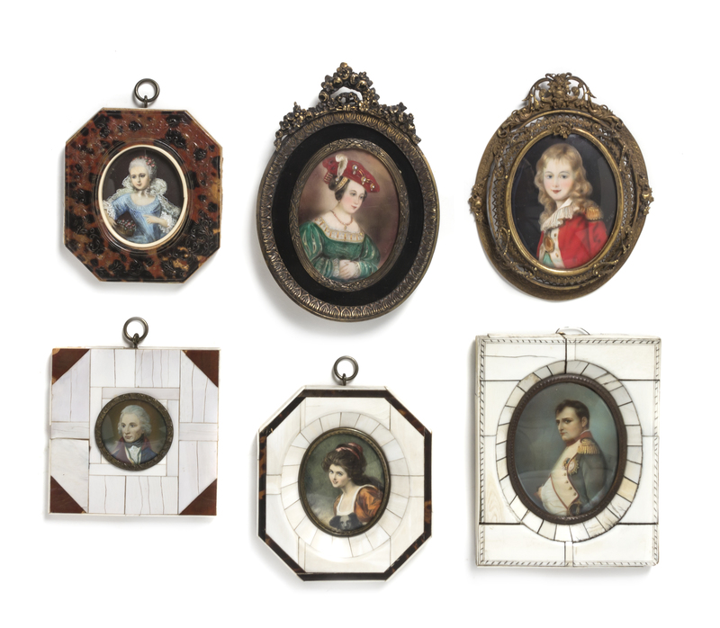 comprising an oval example on ivory depicting Napoleon within an ivory veneered frame, an older gentleman within an ivory veneered frame, a maiden with a dog in an ivory and tortoise shell veneered frame, a maiden within a faux tortoise shell veneered frame, and a young boy and a lady, each within a gilt metal frame.