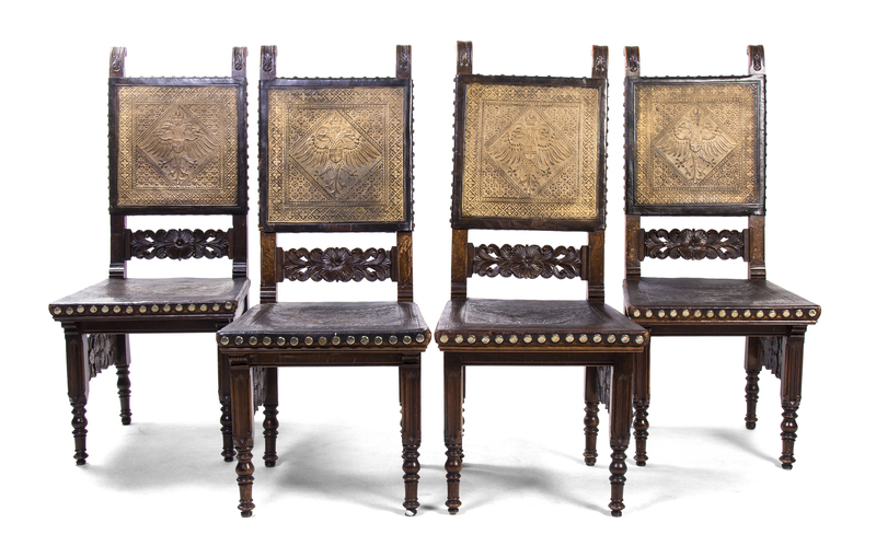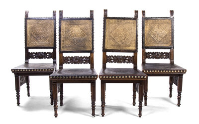A Pair of Continental Carved Walnut and Leather Side Chairs,