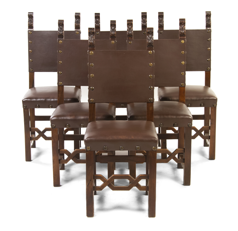 each having a studded leather back over a similar square seat, raised on square legs joined by shaped stretchers.