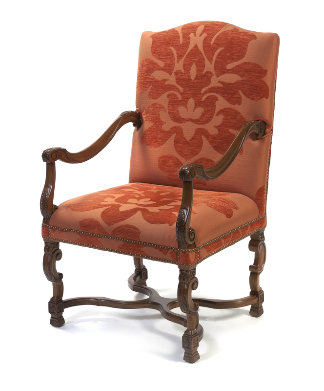 having an upholstered back and seat, raised on acanthus carved legs joined by an X-form stretcher.