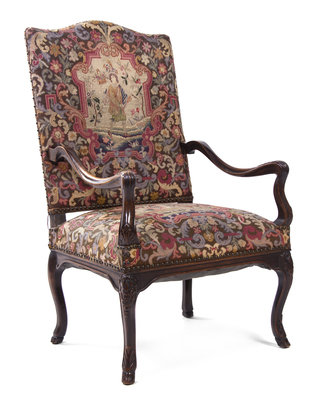 having a needlepoint upholstered back and seat within acanthus carved arms, raised on cabriole legs.