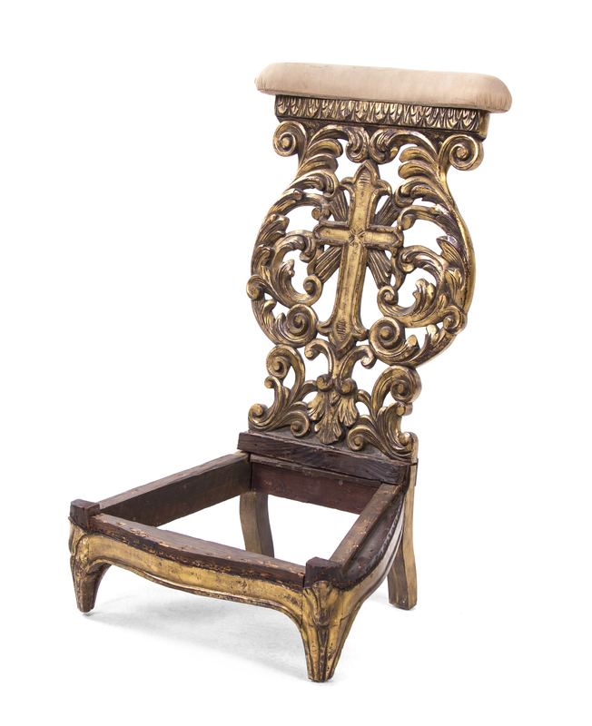 having an upholstered top over the cross and foliate pierce carved back raised on tapering legs.