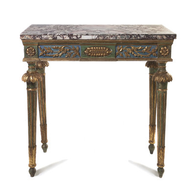 18th/19th century, having a later rectangular breche marble veneered top, the frieze carved with scrolling leaves and rosettes at the corners, raised on fluted tapering legs.