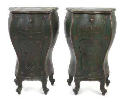 each having a shaped top over a single drawer above a panel door, raised on short cabriole legs, having Chinoiserie decoration with gilt highlights throughout.