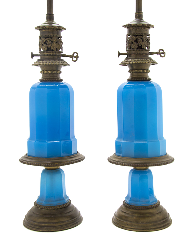 each of faceted baluster form in blue glass with faux oil lamp fittings.