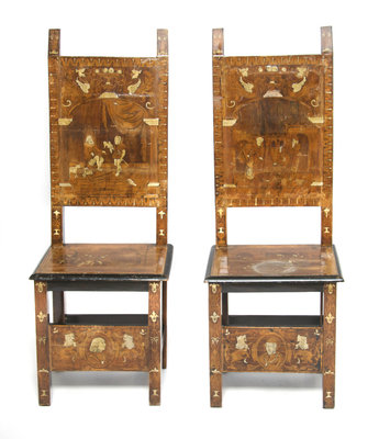 constructed of fruitwood with ivory inlay throughout depicting figural scenes, raised on square legs joined by stretchers at front and back.