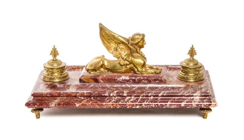 centered with a recumbent winged sphinx set on a rectangular marble base, further inset with twin ink pots.