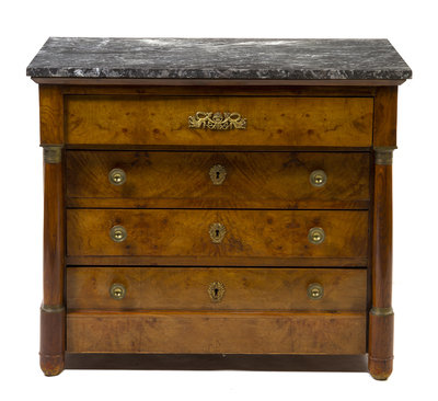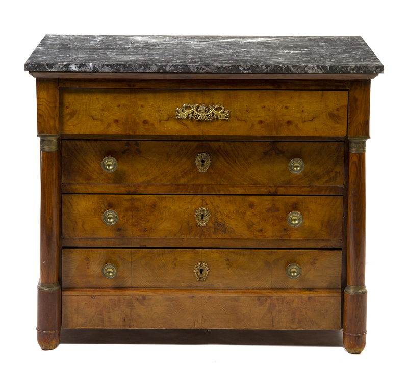 having a rectangular gray-veined marble top over the brass mounted frieze drawer above three long drawers flanked by cylindrical supports, ending in shaped feet.