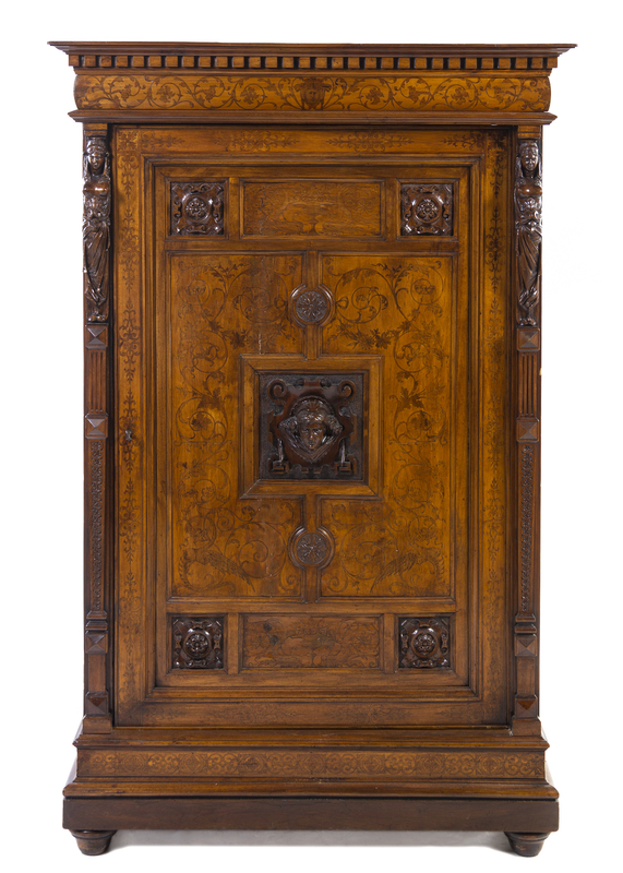 having a dentiled cornice over the conforming case enclosing a rosette and mask carved door flanked by female terms, raised on a plinth base ending in conical feet with painted and incised decoration throughout to show foliate scrolls and masks.