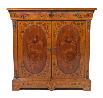 having a rectangular top over a single drawer above two panel doors raised on bracket feet, having exotic bird and foliate inlays throughout.