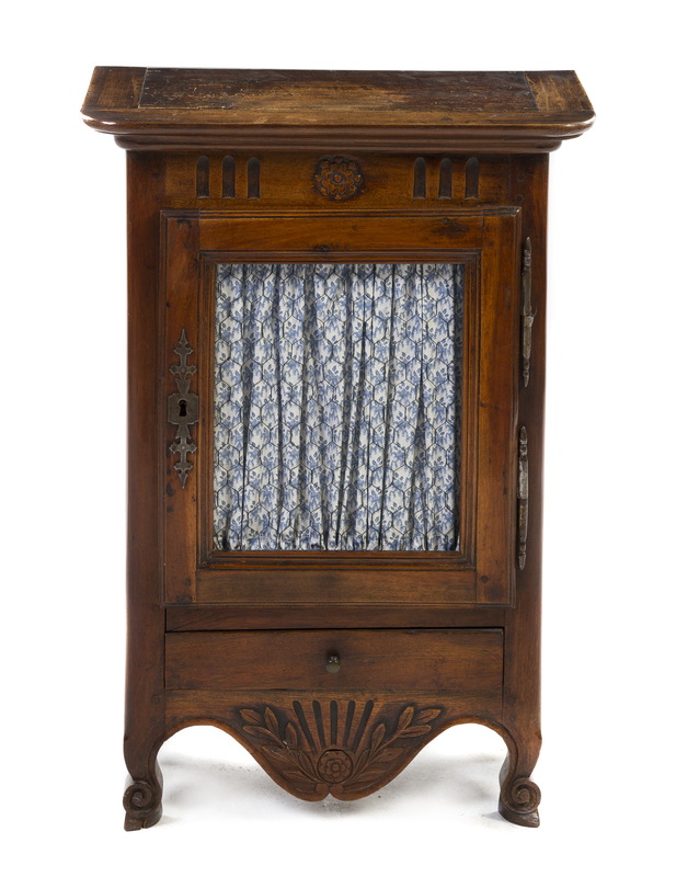 the rectangular top above the conforming case set with a single grill inset door above a single drawer, raised on scrolled feet.