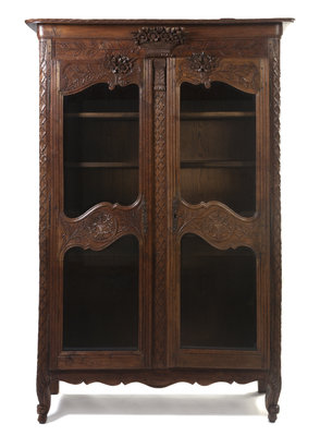 the crest carved with a basket issuing flowers over the two beveled glass inset foliate carved doors opening to a shelved interior, the whole raised on short cabriole legs.