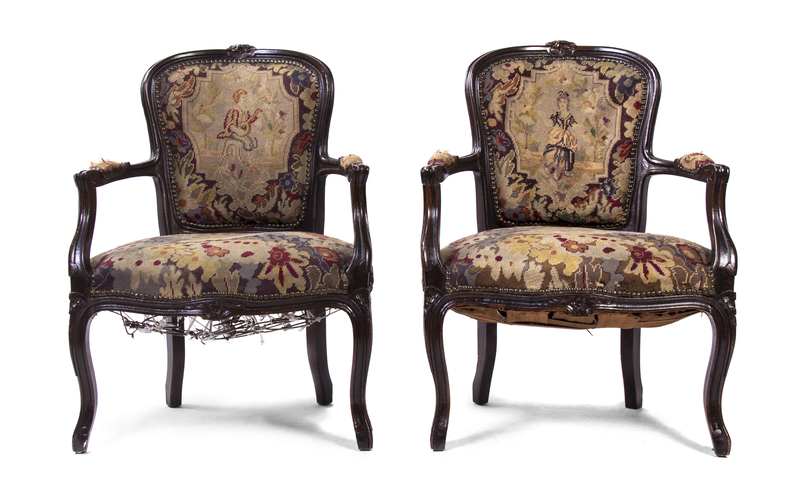 each having a foliate carved crest rail over a shield form needlepoint back and arms with scroll carved terminals above a shaped needlepoint seat, raised on cabriole legs.