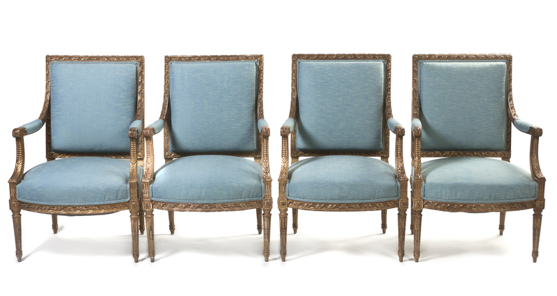 A Set of Four Louis XVI Style Giltwood Open Armchairs,