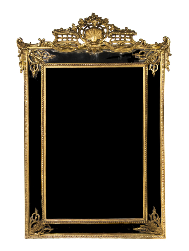 having a pierce carved shell and rocaille crest, over the vertical rectangular beveled plate within a mirrored border, the frame with egg and dart and foliate decoration throughout.