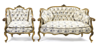 comprising a bergere and a settee, each with a carved foliate crest over the tufted back and upholstered sides and seat, raised on cabriole legs, ending in scrolled toes.