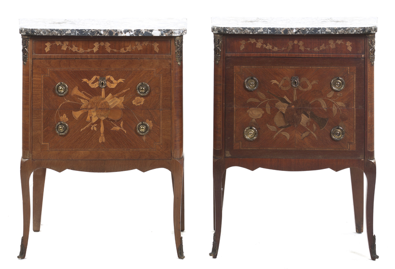 each having a square marble top with rounded front corners above the case with a vine inlaid frieze over two long drawers inlaid to show musical trophies, raised on cabriole legs ending in sabots.