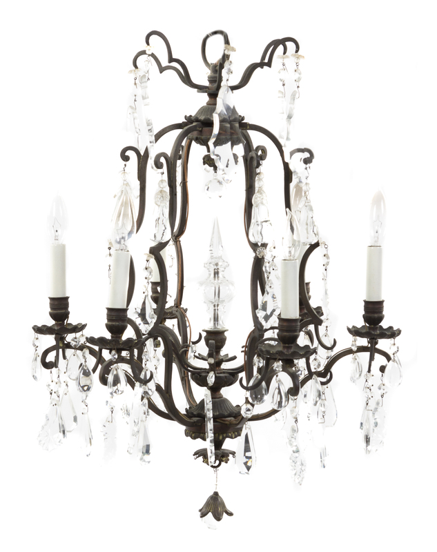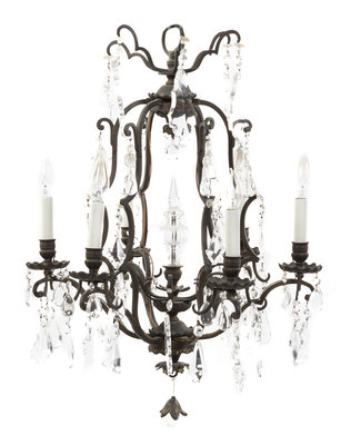 of cage form with a central glass spike, hung with prisms in four tiers and a row of glass pears.