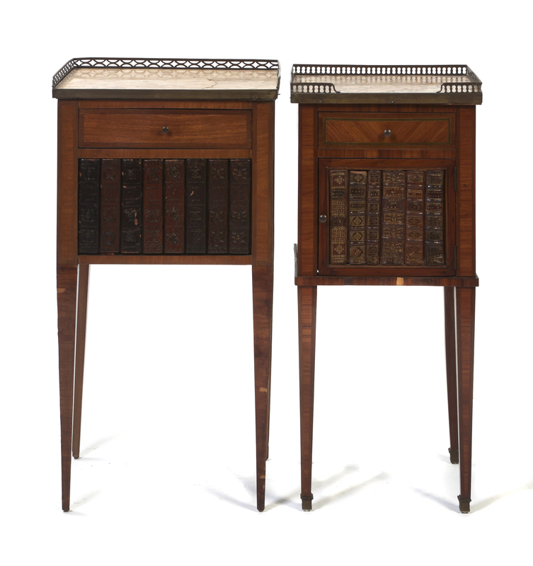 each with a three-quarter galleried rectangular marble top above a frieze drawer and a book binding faux front cupboard, raised on square tapering legs.