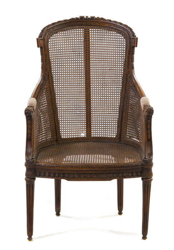 19th century, having a ribbon and bellflower carved crest rail above an enclosed back and upholstered arms over a shaped seat, raised on fluted cylindrical tapering legs.