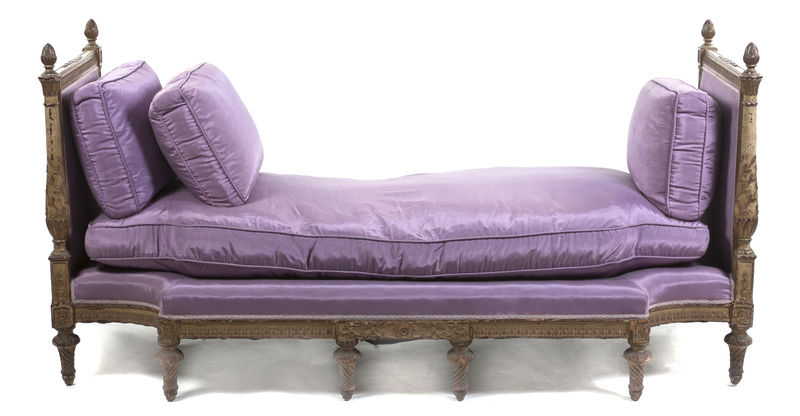having upholstered ends with pine cone finials atop vine decorated supports, raised on twist carved tapering legs.