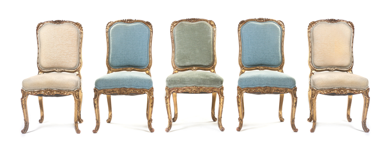 A Set of Five Louis XV Style Giltwood Side Chairs,