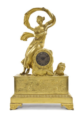 surmounted by a robed maiden, having a circular dial with Roman numeral hours surrounded by seashell motifs, all above a frieze depicting gods and goddesses raised on scroll and acanthus feet, with time and strike movement.