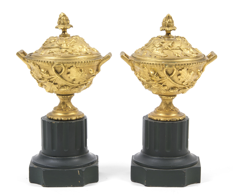 A Pair of French Gilt Bronze Diminutive Urns on Stands,