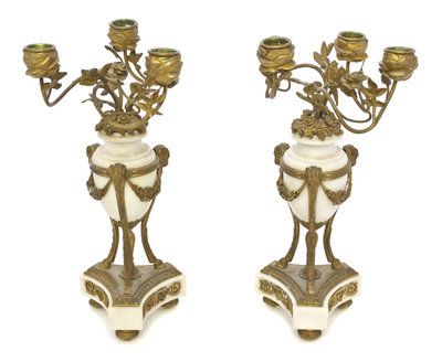 A Pair of Louis XVI Style Gilt Bronze and Marble Three-Light Candelabra,