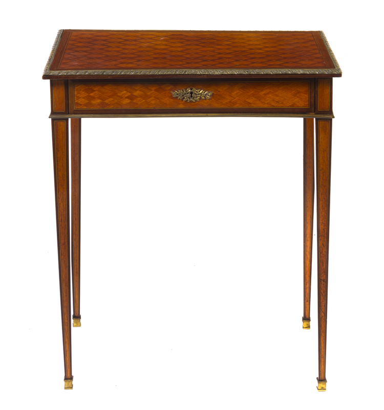 having a crossbanded and parquetry inlaid top with a gilt metal mounted edge over a single frieze drawer, raised on square tapering legs ending in brass caps.