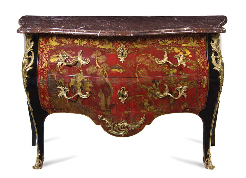 having a serpentine rouge marble top over the conforming case fitted with two drawers, raised on slightly splayed legs ending in sabots, having Chinoiserie decoration throughout.