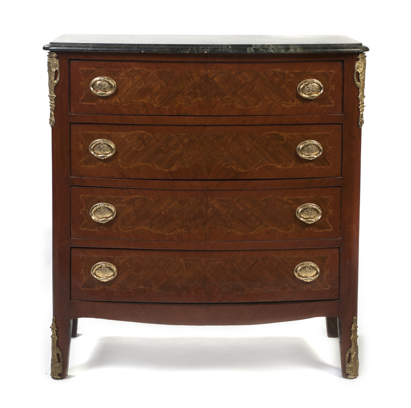 having a rectangular marble top with a bowed front set on a conforming case fitted with four drawers, having scrolling foliate inlays throughout.