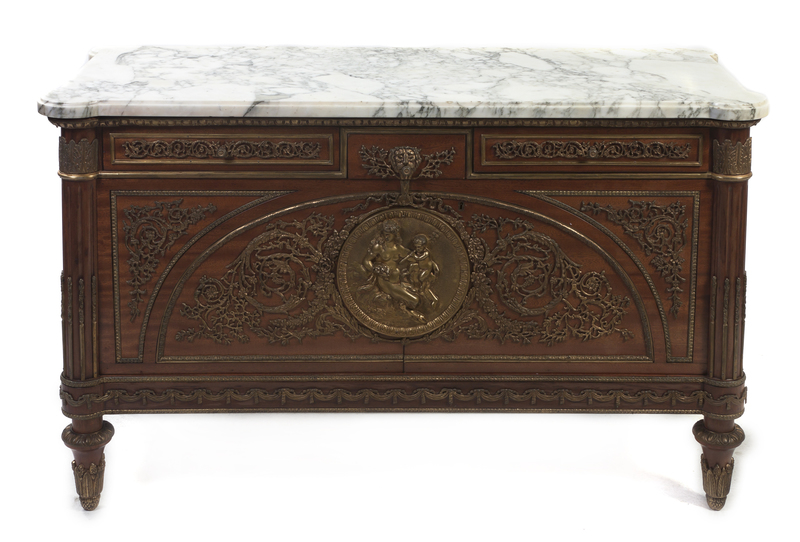 having a rectangular marble top with turret corners, the case with two aligned drawers above two paneled doors centered with a gilt bronze medallion depicting a maiden with a putto playing a horn, the whole with foliate, swag and scroll mounts throughout, raised on toupie feet.