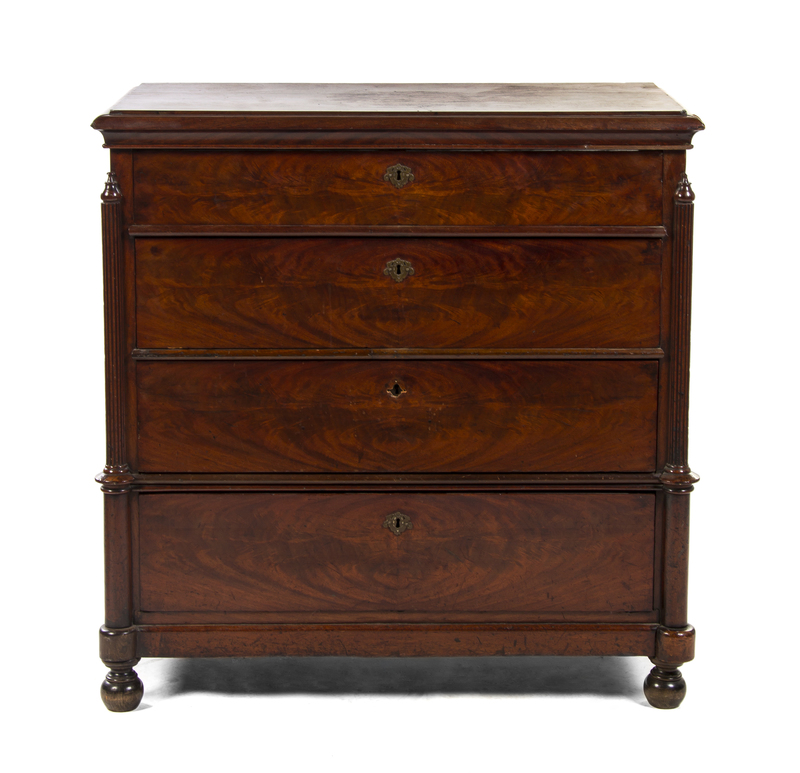 having a rectangular top over four graduated drawers flanked by reeded three-quarter columns, raised on ball feet.