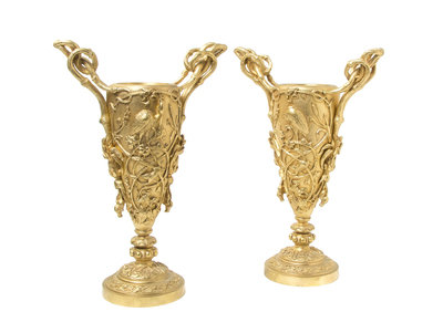 each of tapering form with branch form handles, decorated with exotic birds, rodents and reptiles amidst a marshy ground, raised on a stepped circular foot.