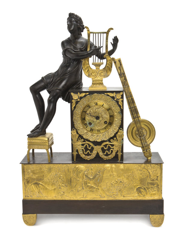 having a foliate scroll cast circular dial having Roman numeral hours within a square case surmounted by a seated Apollo strumming his lyre, raised on a rectangular case mounted with a cast plaque depicting Apollo playing his lyre for lions and a boar within a wooded landscape, terminating on shaped feet, with time and strike movement.