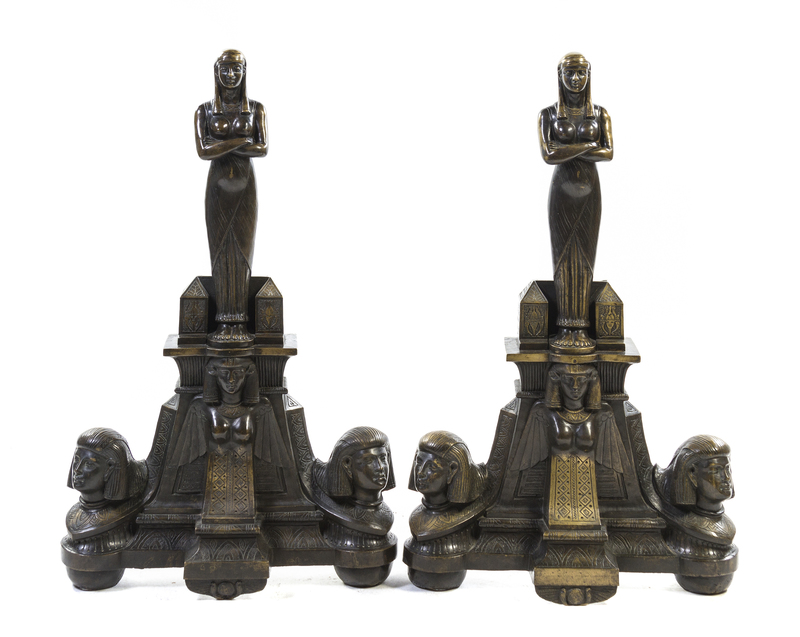 each cast with a standing female figure over the shaped base with caryatids flanked by masks.