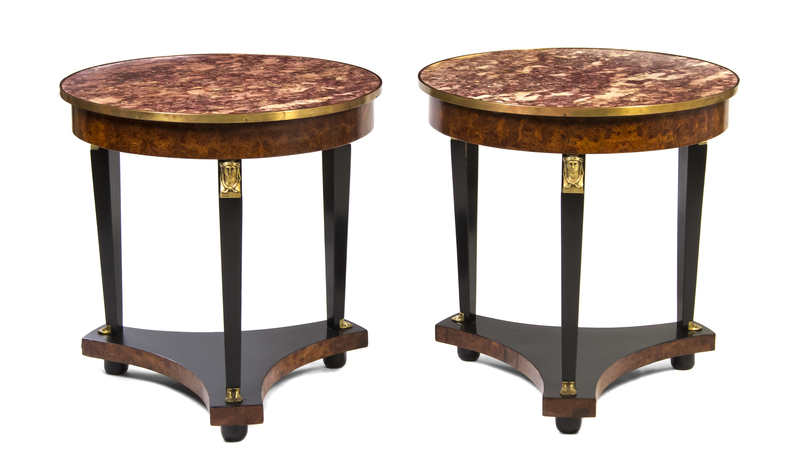 A Pair of Empire Style Gilt Metal Mounted Burlwood Gueridons,