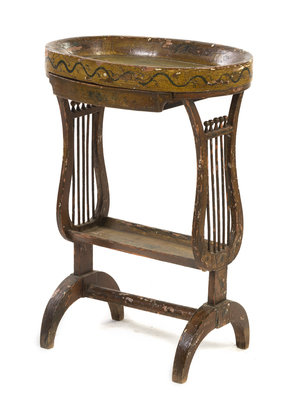 having an oval dished top over a single frieze drawer, raised on lyre form supports joined by a medial shelf, raised on splayed legs.