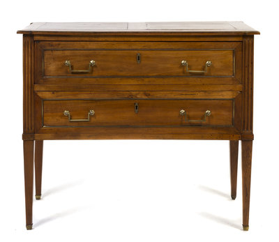 having a planked rectangular top over two long drawers flanked by fluted supports, raised on square tapering legs ending in brass caps.
