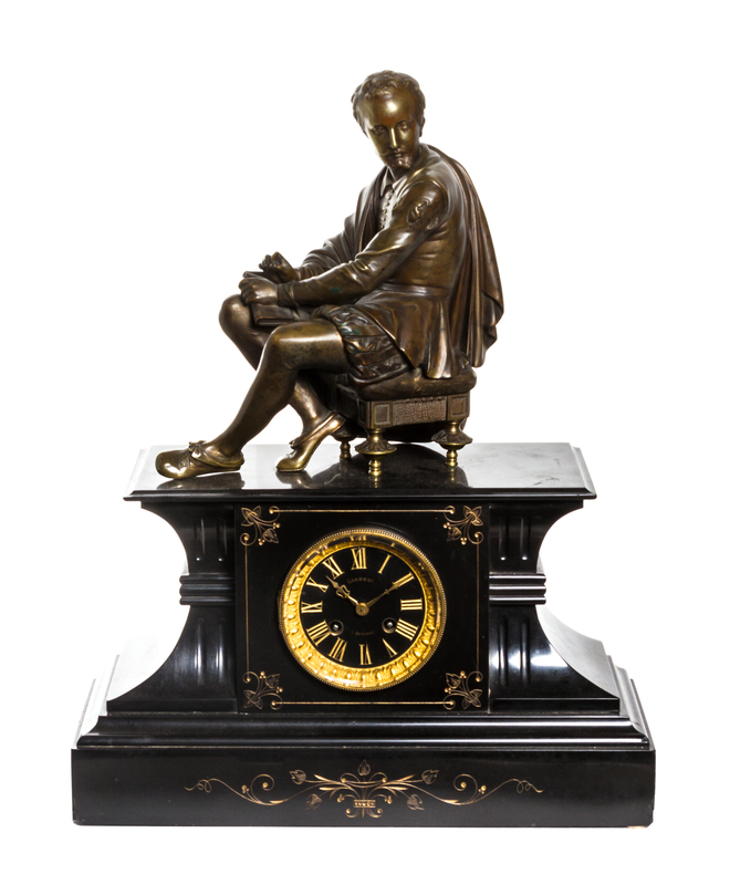 having a circular dial with gilt Roman hours, signed Garreau a Orleans, within a shaped case surmounted by a bronze figure of a seated William Shakespeare, the figure signed Peiffer.