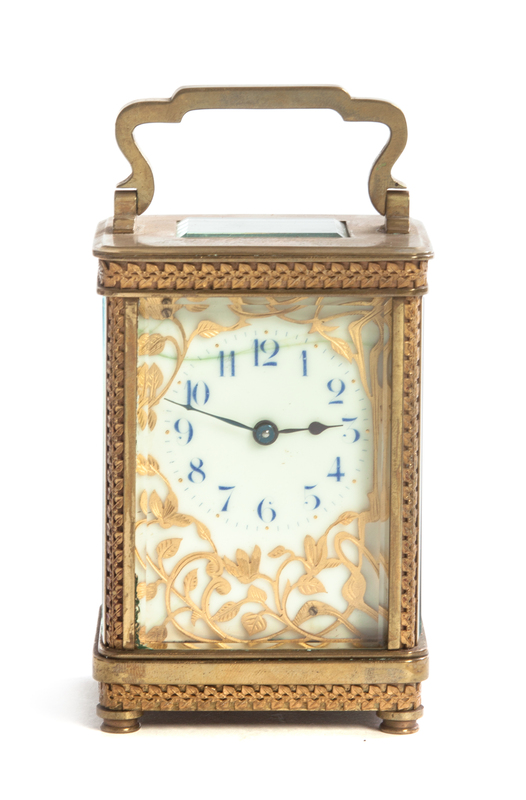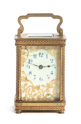 having a swing handle over the foliate decorated dial with Arabic hours, having time only movement, with engraved presentation dated 1911 to top of clock, with key and fitted leather case.
