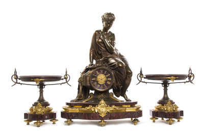 A French Rouge Marble, Gilt and Patinated Bronze Three-Piece Clock Garniture, retailed by H. Pallenberg, Cologne,